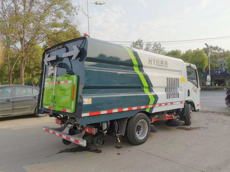 该扫路车采用解放二类底盘改装,加装副发动机、风机、清水箱、垃圾箱、左右立扫、后置吸盘,扫盘降尘系统,液压系统、专用装置电控系统和副车架等改装而成。