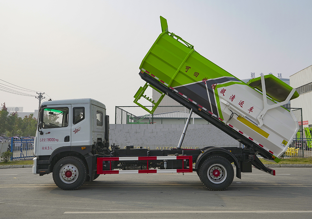 侧装对接式垃圾车的装载容积是12立方,特点是一个车能配几十个垃圾桶,能实现一台车与多个垃圾桶联合作业,循环运输,充分提高了车辆的运输能力,特别适用于短途运输,如环卫部门对城镇垃圾的清理、运输等。同时,挂桶垃圾车还可以加装其它功能,形成其它多功能挂桶垃圾车,如:挂桶压缩式垃圾车、挂桶式泔水垃圾车、挂桶式对接垃圾车等。